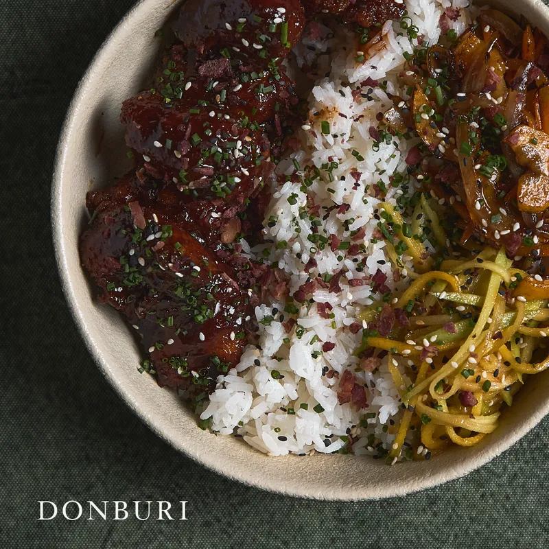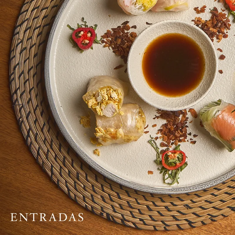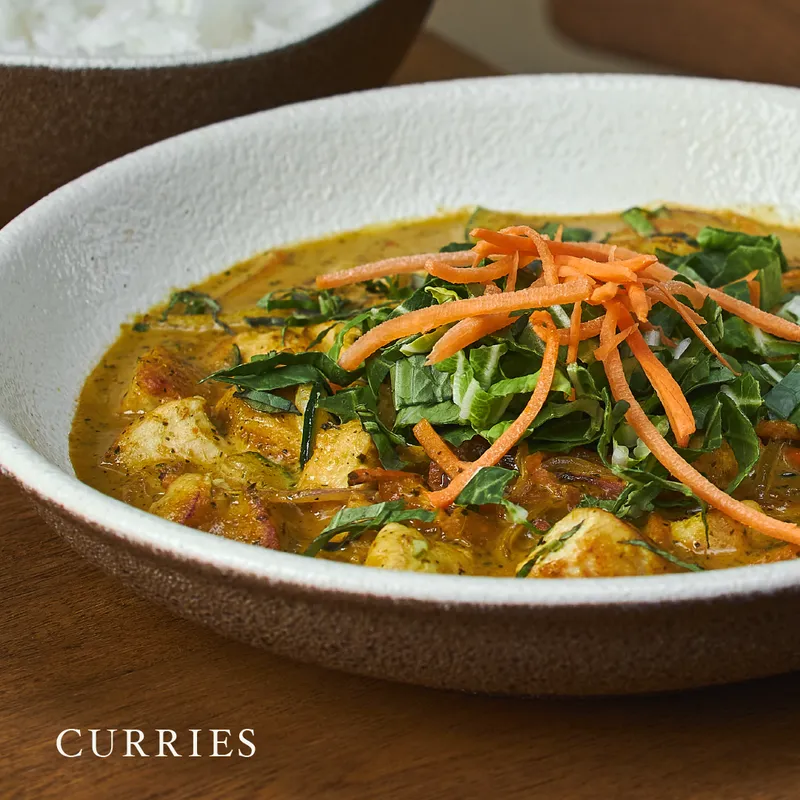 Curry rojo tailandés preparado en leche de coco, mazorcas baby, calabaza, lima kaffir, limonaria, jengibre, cebolla y albahaca thai.