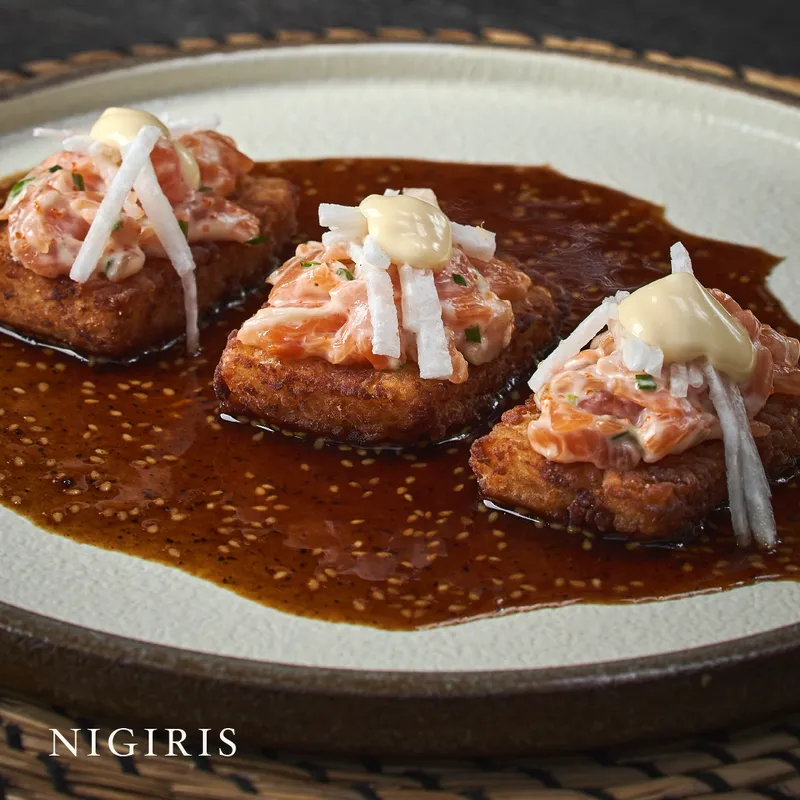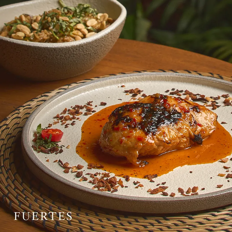 Curry massaman tailandés preparado en leche de coco, champiñones, papa, cebolla, maní, tamarindo, lima kaffir con toques de canela.