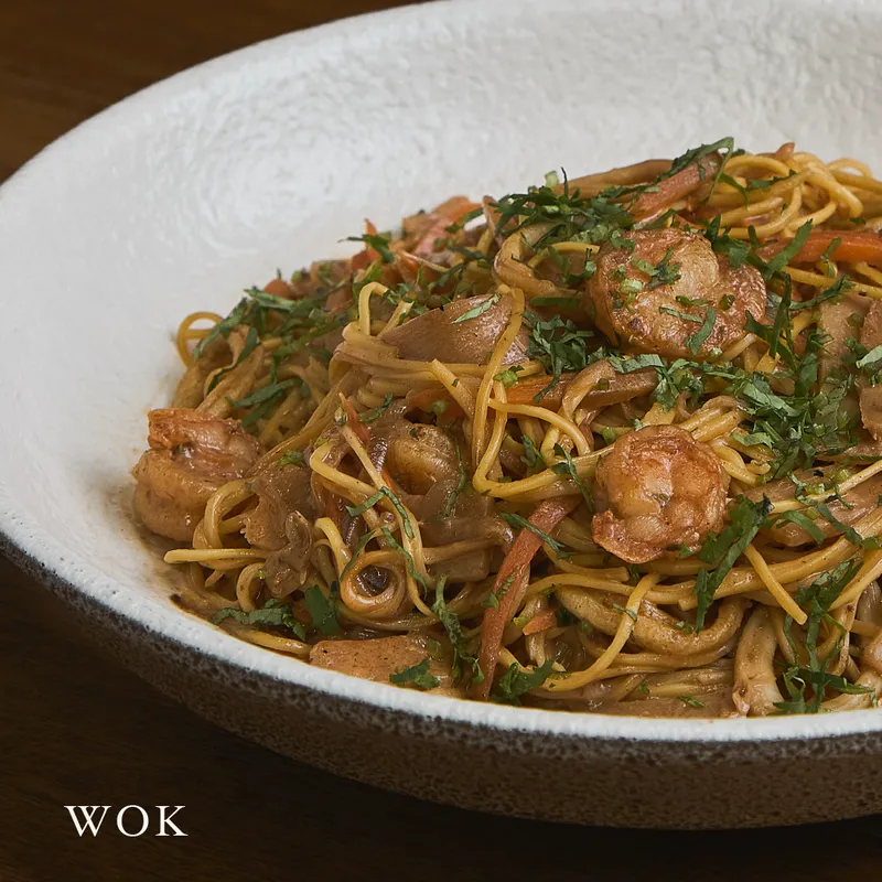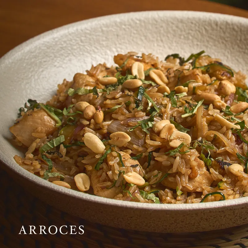 Wok de pasta de arroz, brotes de soja, cebollín, tortilla de huevo, tamarindo, maní y cilantro. Elige pollo o queso como proteína